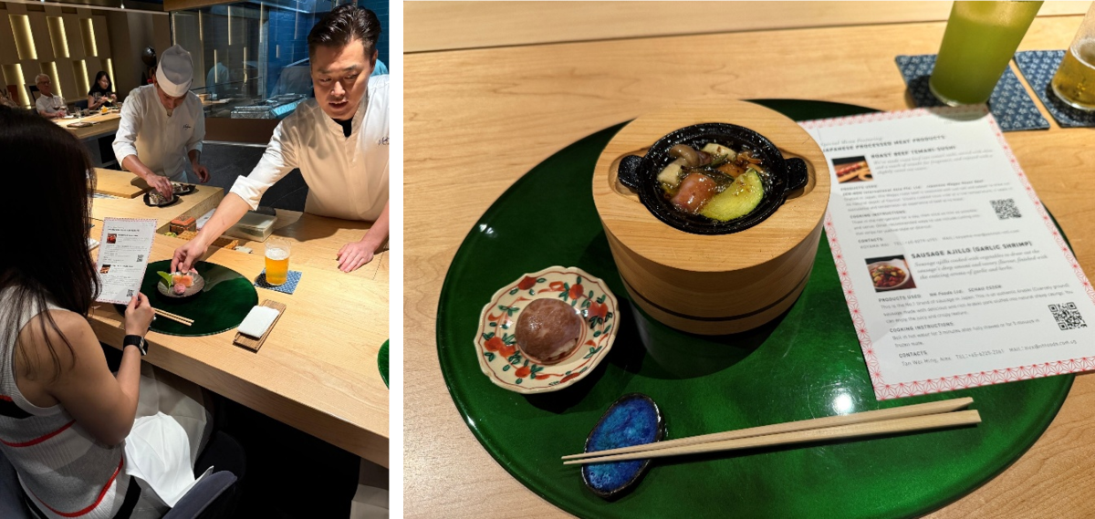 Food Japan 2024出展の翌年には、現地の日本料理好きへのアプローチを目的に、ご協力いただいたシェフがオーナーシェフを務める日本料理店にて、企画いただいた特別メニューを、コース料理の一部として期間限定で提供していただきました。実際に召し上がっていただいたシンガポールの方々からは「美味しい」という声だけでなく、「メニューで使われていたソーセージが美味しかったので日系スーパーへ買いに行きました」といった声も聞かれ、現地の日本料理好きを媒介に、日本の食肉加工品の広がりに貢献しました。