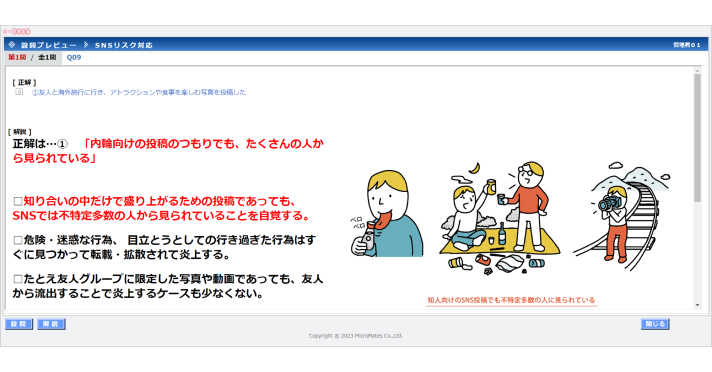 危機発生時に必要なアクションや注意点が学べる「初動対応編」と、プライベートでのSNS利用における注意点や対応ノウハウを伝える「SNSリスク編」の2種類のコンテンツを用意しています。